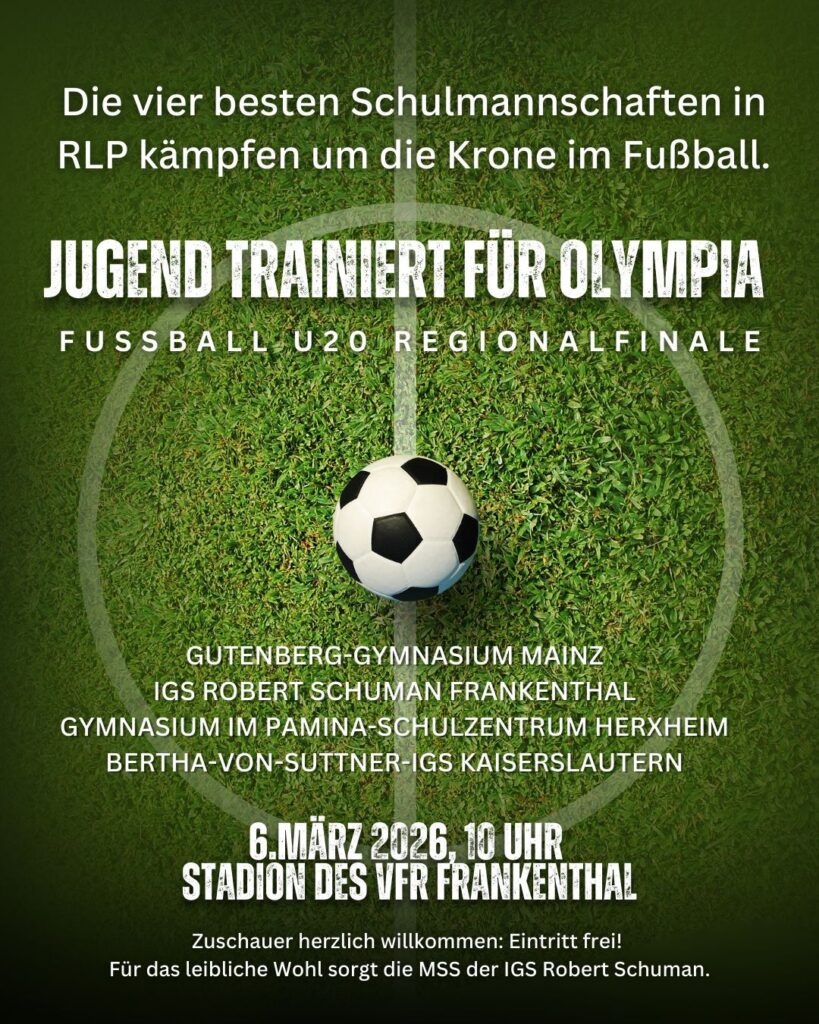 By Alicia Pedersen 22. Februar 2026 No Comments Jugend traininert für Olympia Fußball U20 Regionalfinale Am 6. März findet das Regionalfinale Fußball U20 von Jugend trainiert für Olympia in Frankenthal statt und unsere Schulmannschaft ist dabei.